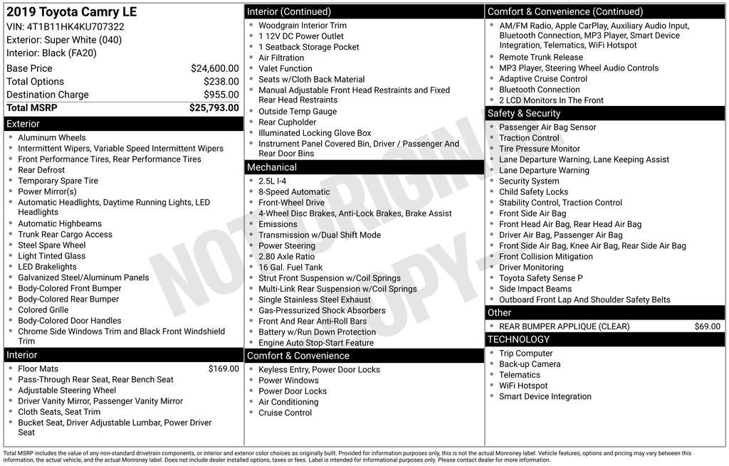 Whether you're commuting to work, running errands, or embarking on a road trip, this 2019 Toyota Camry LE is the perfect choice. With its exceptional blend of style, comfort, and efficiency, it's a vehicle you can truly feel confident and proud to own. Visit our showroom today to experience the Camry's exceptional capabilities for yourself.