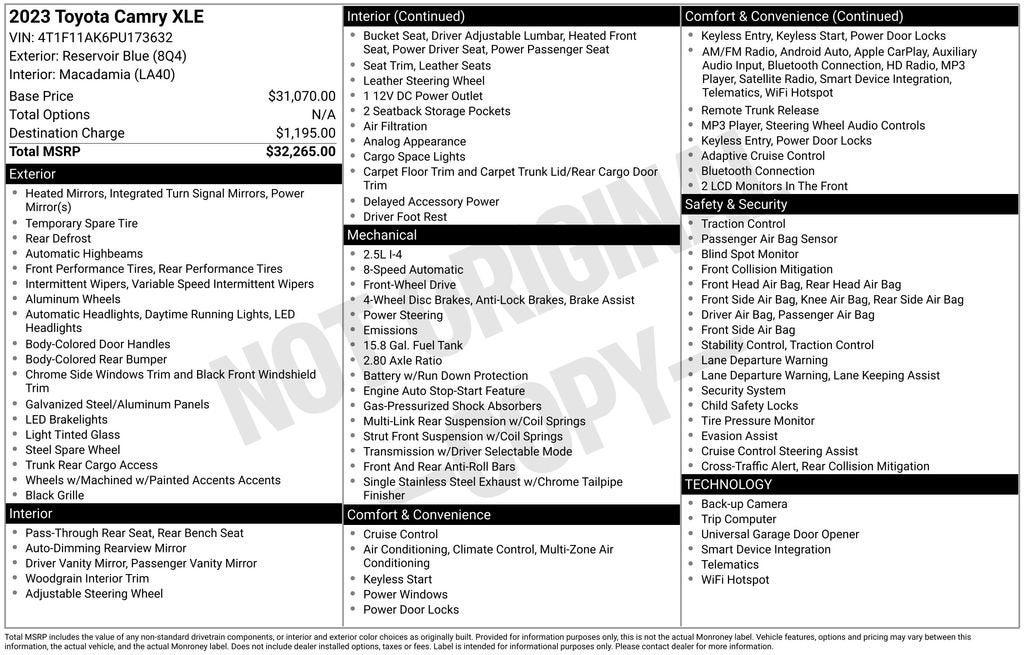 Discover the exceptional 2023 Toyota Camry XLE, a sophisticated and well-equipped sedan that seamlessly blends style, performance, and advanced technology. With its striking blue exterior and a meticulously crafted interior, this Camry XLE is poised to exceed your expectations.Boasting an impressive array of features, this Camry XLE is designed to elevate your driving experience. Key highlights include:- 6 Speakers- AM/FM radio: SiriusXM- Air Conditioning with Automatic Temperature Control- Power Driver's Seat- Steering Wheel Mounted Audio Controls- 4-Wheel Disc Brakes with ABS- Dual Front and Side Impact Airbags- Rear Backup Camera- Auto High-Beam Headlights- Apple CarPlay and Android Auto IntegrationThe 2.5L I4 DOHC 16V engine, paired with an 8-speed automatic transmission, delivers an exceptional balance of power and efficiency, with an EPA-estimated 27 city/38 highway mpg. This Camry's responsive handling and smooth ride quality will make every journey a pleasure.Step inside the spacious and well-appointed cabin, where you'll be greeted by premium features such as:- Perforated Leather Seat Trim- Heated Front Seats- Power Adjustable Passenger Seat- Tilt and Telescoping Steering Wheel- Auto-Dimming Rearview Mirror- Garage Door TransmitterThe Camry XLE's advanced safety technologies, including the Emergency Communication System and Electronic Stability Control, provide you and your loved ones with the utmost confidence and protection on the road.With its exceptional value, uncompromising quality, and impressive array of features, the 2023 Toyota Camry XLE is a standout choice in the midsize sedan segment. Experience the difference for yourself by scheduling a test drive at our showroom today. We're confident you'll be impressed by this remarkable vehicle.